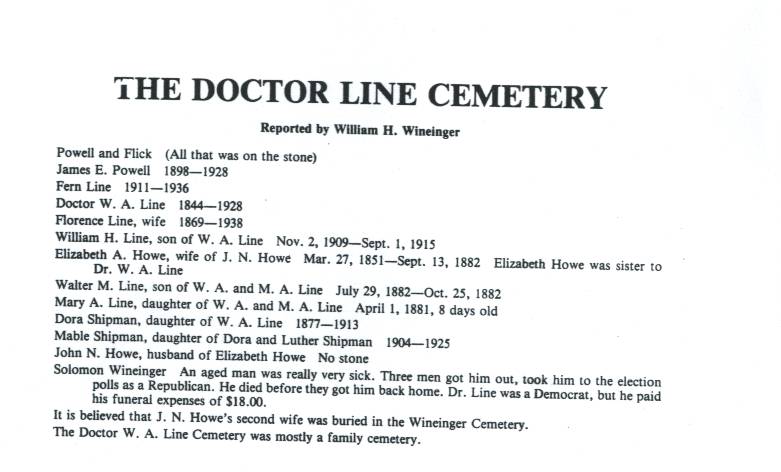 Elizabeth A. wife of J.N. Howe MAR 27, 1851 SEPT 13, 1882 Rev. William H. Wineinger, who recorded this cemetery in 1977, list this Elizabeth as the Doctors' Sister. Rev. Wineinger also reports that John N. Howe is buried in this cemetery sans monument. |